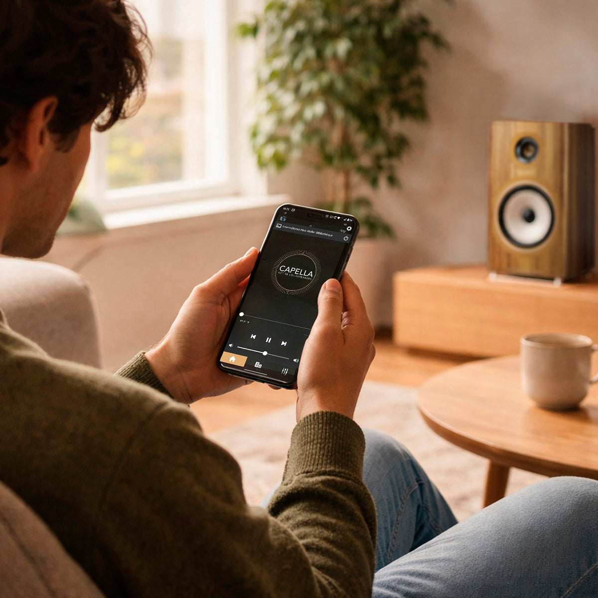 The TRIANGLE CAPELLA app is the system's dedicated interface. It handles speaker networking and configuration, while providing full access to general settings and sound adjustments.