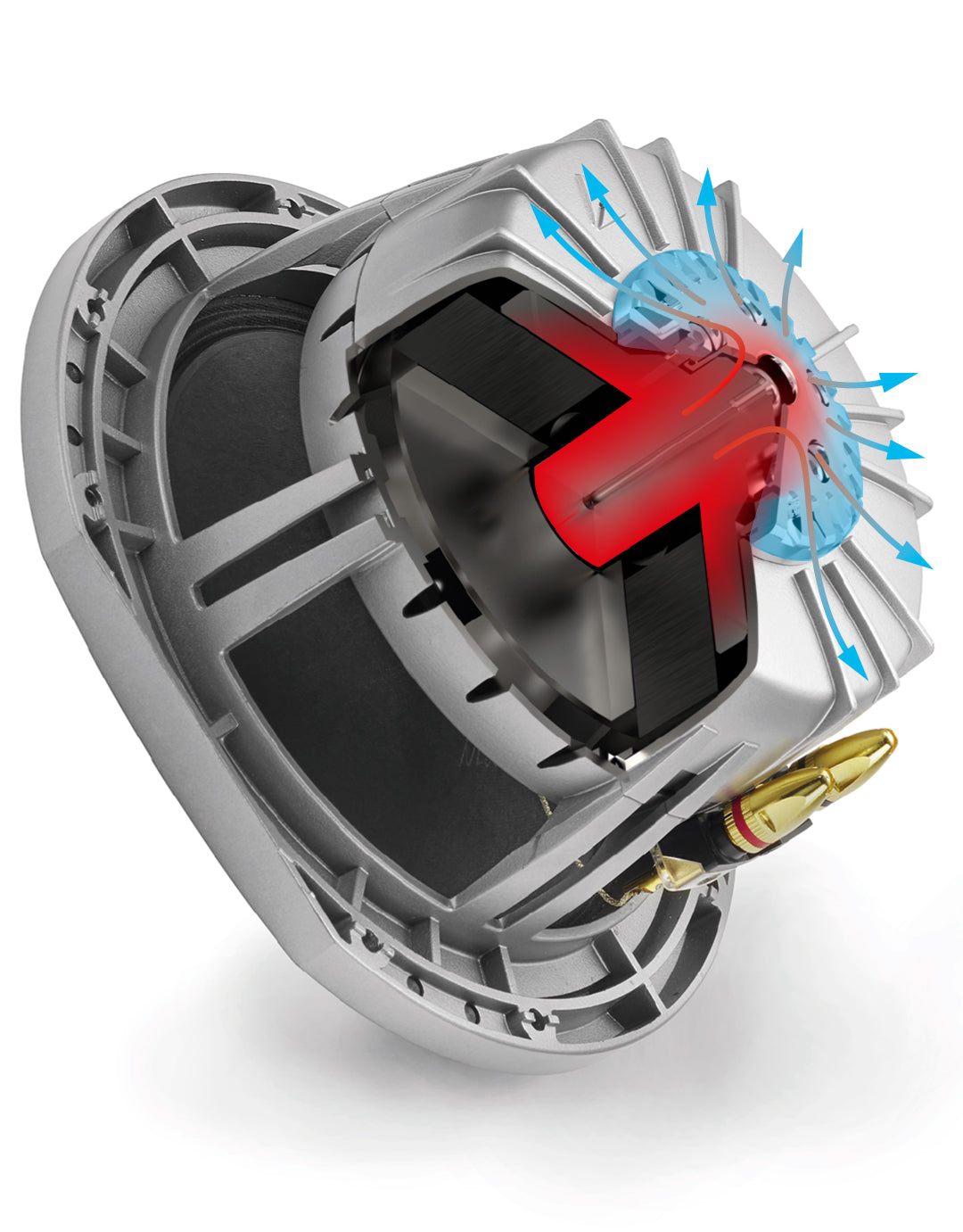 It provides the ideal combination of mass damping and rigidity to the moving coil. The driver thus handles strong impulses without distortion.